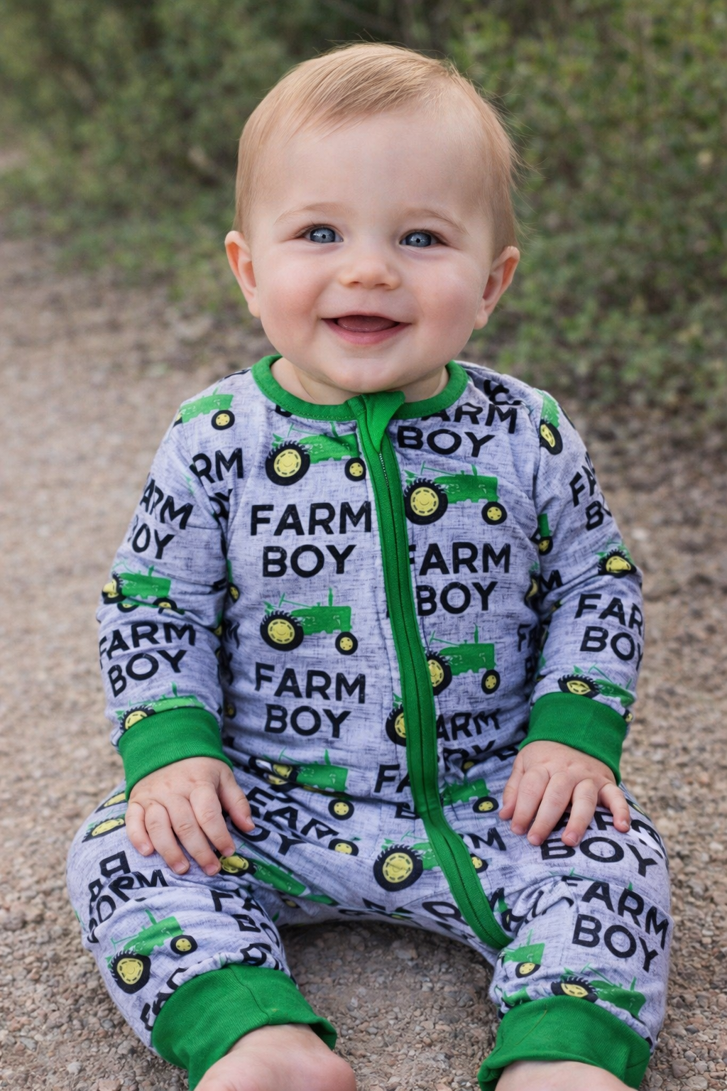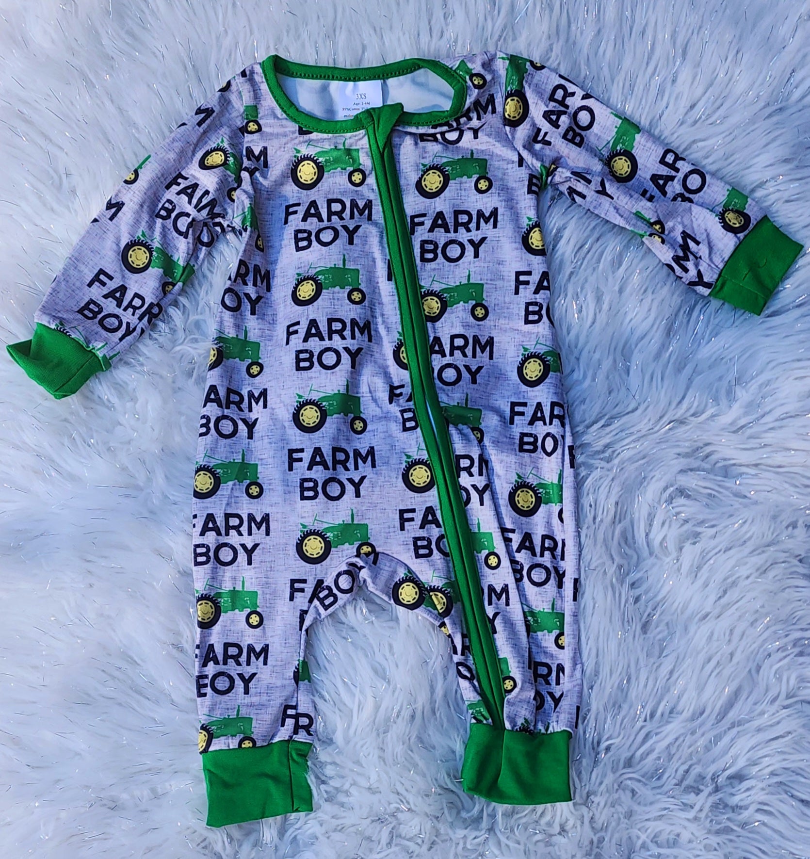 Baby boy's zippered sleeper with green tractors saying "Farm Boy"