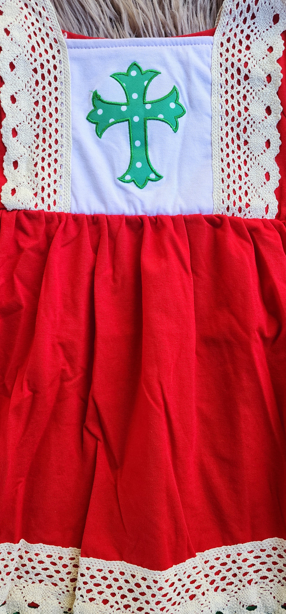 Girl's long sleeve Christmas dress with embroidered cross and lace trim.