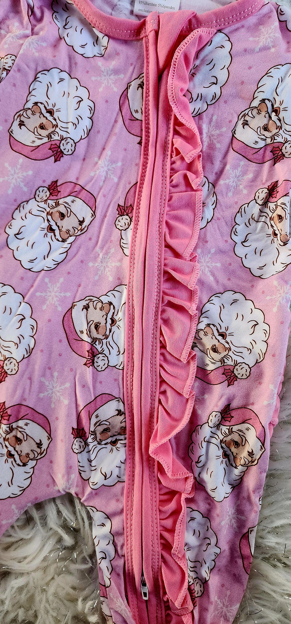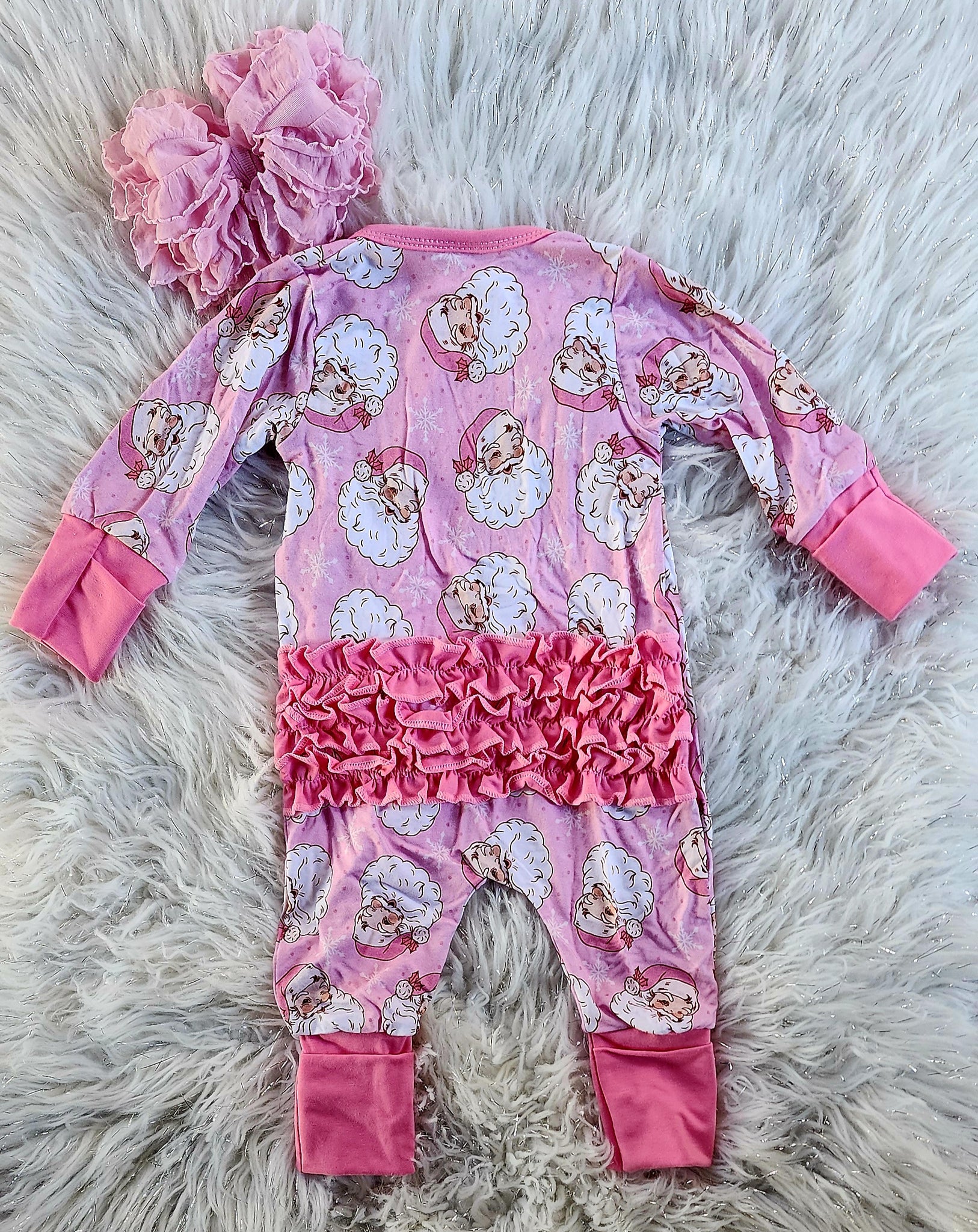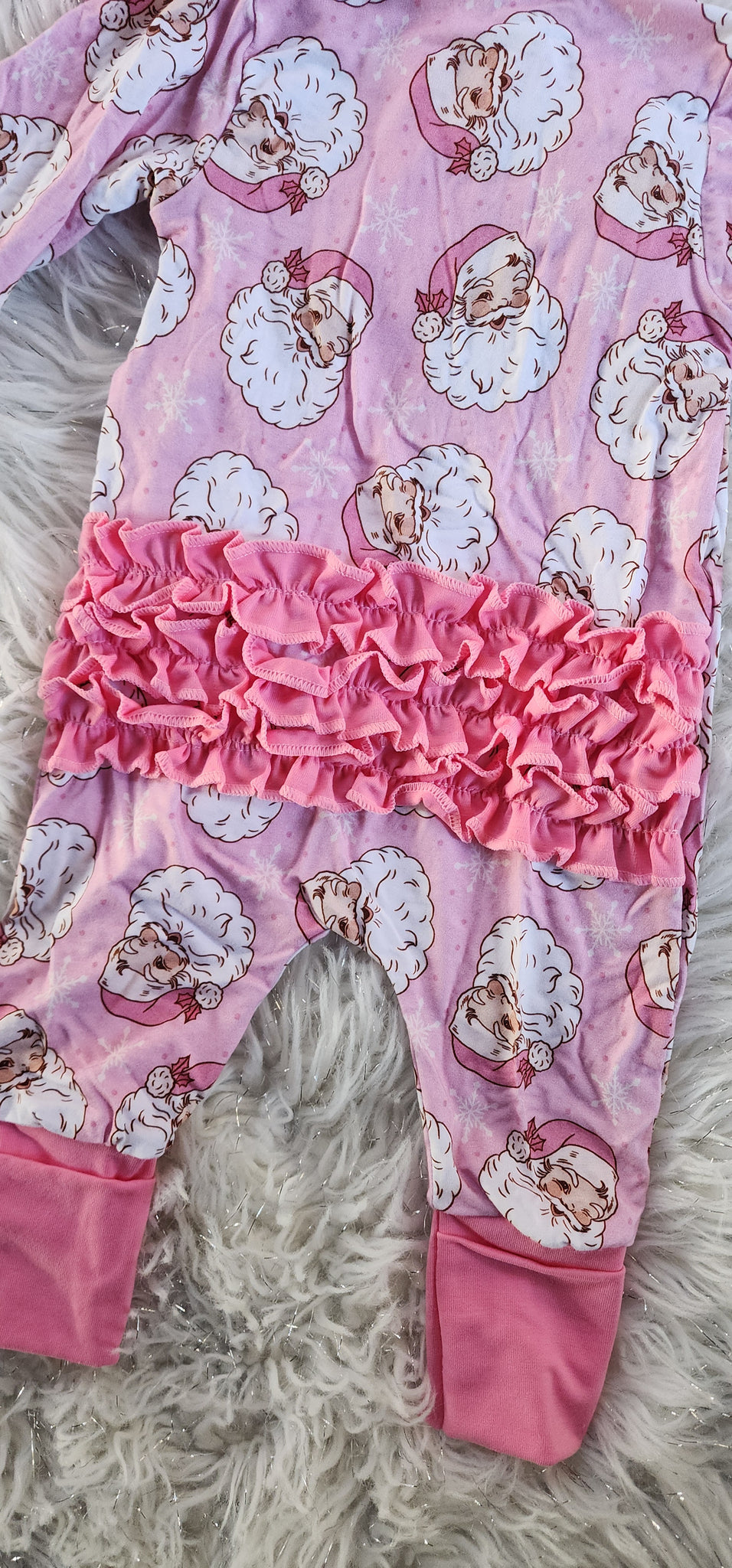 Girl's pink Christmas Bamboo Sleeper with Santa and Ruffle butt.
