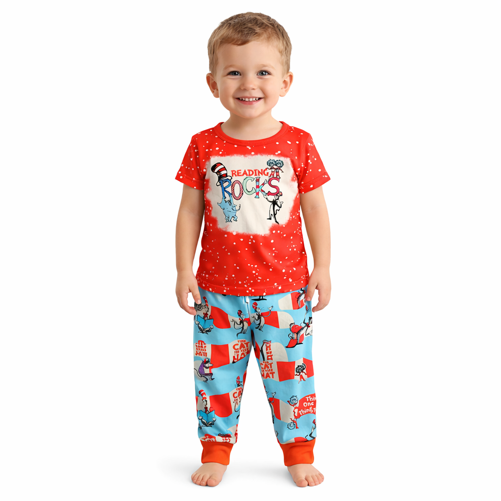 Boy's Dr Seuss pants set with bleached style tee saying "reading rocks" with matching pants.