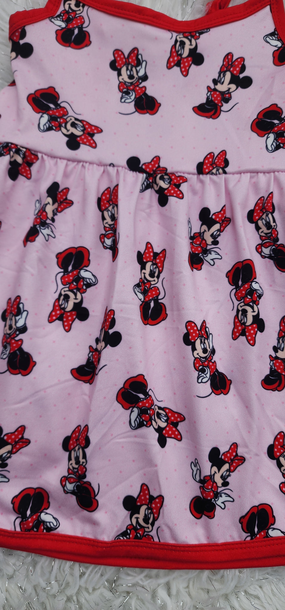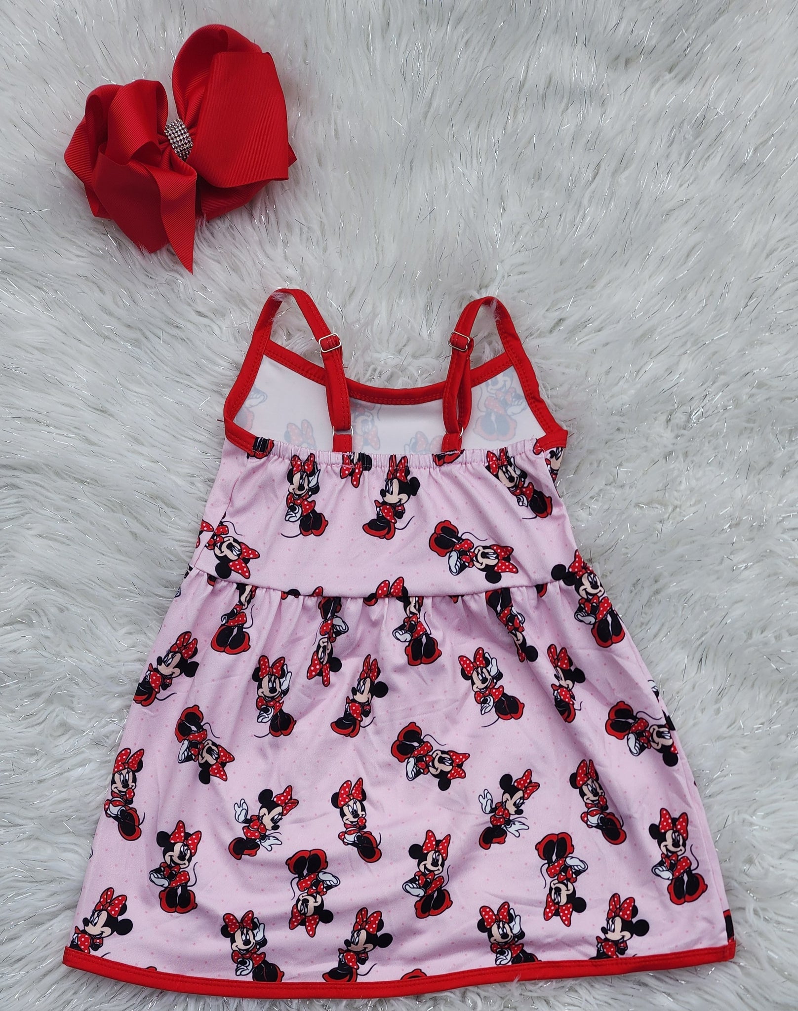 This pink polka dot mouse bow print sundress is the perfect mix of playful and sweet. Featuring an allover bow and mouse silhouette print with vibrant red trim, this girls dress is designed for comfort, style, and everyday wear.